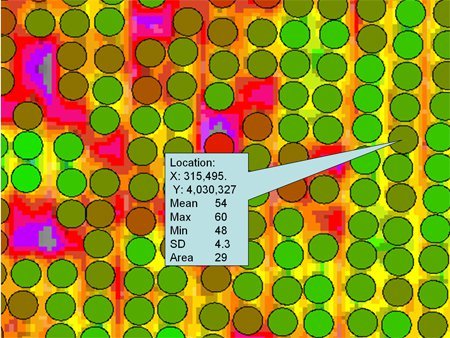 El producto TreeGrading proporciona una evaluación de cada árbol individual en un huerto para ayudar a los agricultores a administrar los árboles para lograr una producción máxima. Pueden recogerse datos de imágenes satelitales de alta resolución QuickBird, IKONOS o SPOT-5 en apoyo de Administración de Agricultura desarrollando mapas TreeGrading para revelar la ubicación y el grado de cada copa de árbol determinado usando un algoritmo espectral patentado. Las propiedades de las imágenes satelitales GVI dentro de cada polígono se extraen a una base de datos Sistemas de Información Geográfi (GIS por sus siglas en inglés) estándar de la industria. El programa GIS se usa entonces para ver y analizar los datos. También se crea una imagen satelital y un mapa GIS de árboles que faltan para que la persona encargada pueda planificar su sustitución.